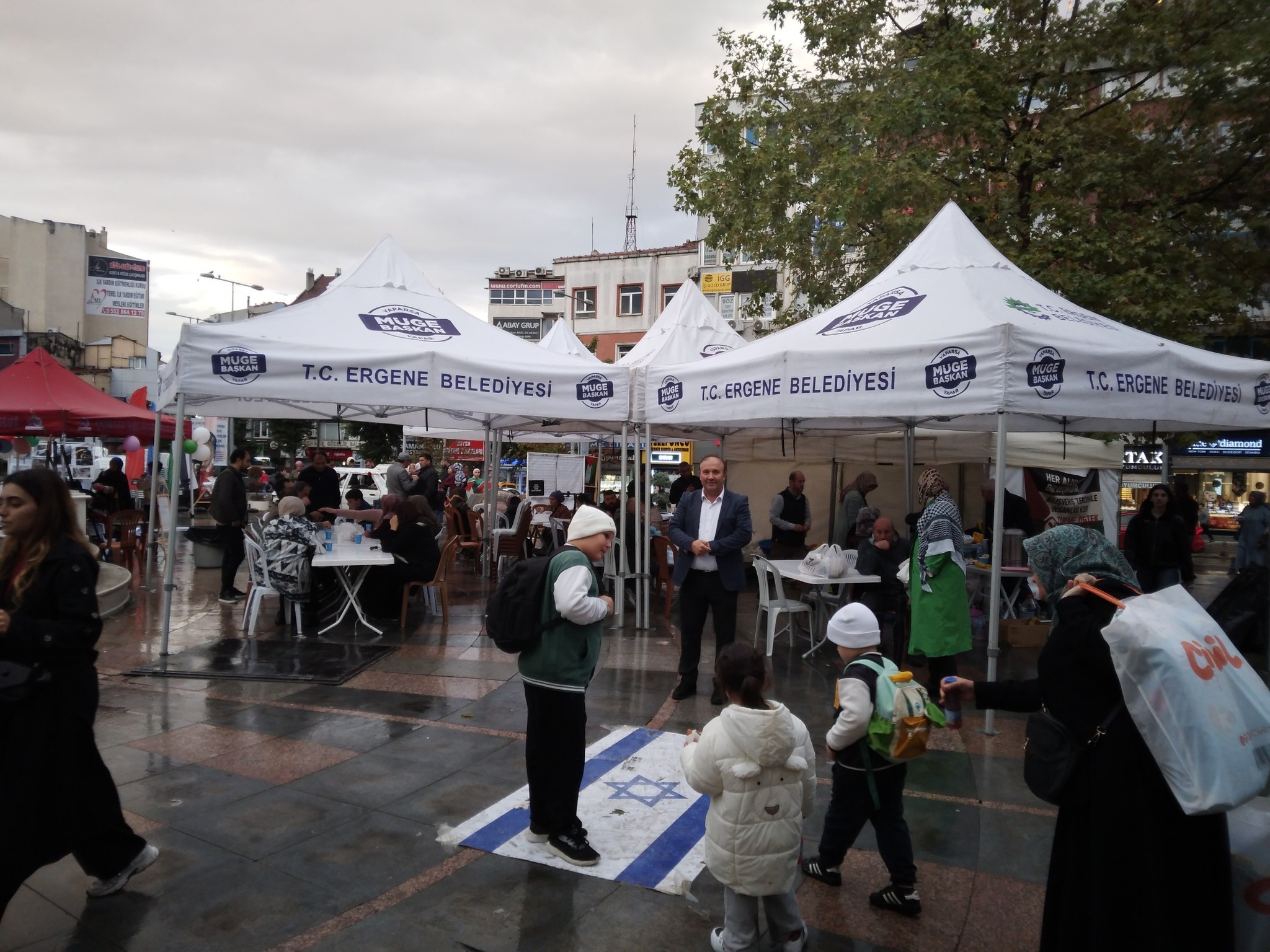 Çorlu Belediyesi önünde düzenlenen FİLİSTİN 🇵🇸 e destek etkinliği kapsamında açılan statlar da vatandaşlar yağmur altında bir hayli zor anlar yaşadığı esnada Ergene Belediye Başkan Müge Yıldız Topak Belediye ye ait çadırları ve ekipmanları Çorlu ya gönderdi.