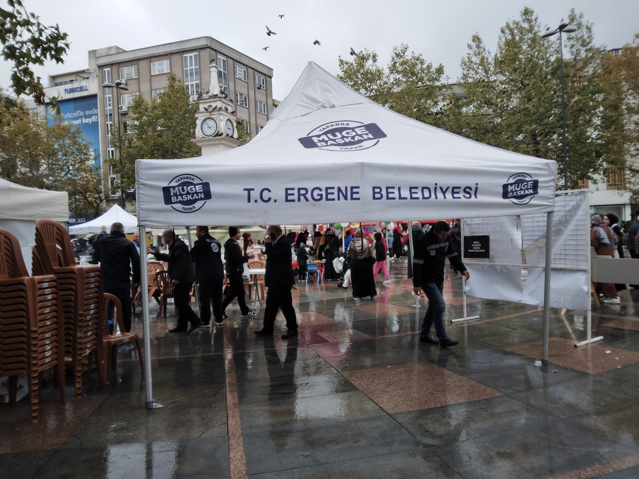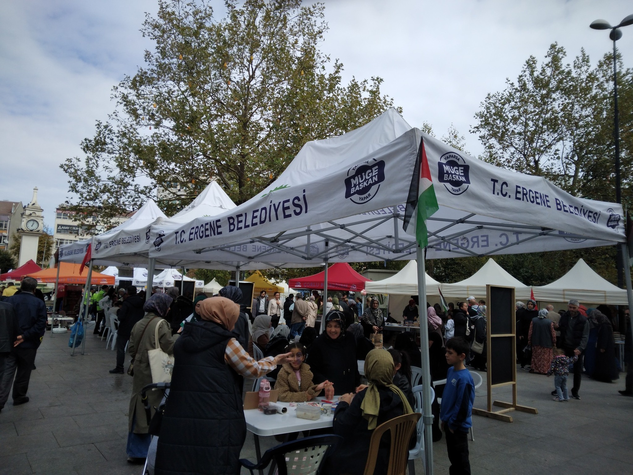 Yağmur altında zor şartlarda statlarda hizmet vermeye çalışan vatandaslarla kermese gelenler yapılan bu anlamlı destek için teşekkür ettiler. Cumartesi ve Pazar günü devam eden etkinlikte Müge baskan in çadır desteği ve Belediye ekipmanlarıni seferber etmesi kamuoyunda büyük bir taktirle karşılandı. Çadırların gelmiş olması da geliri tamamen Filistin e bağışlanacak olan satışların artmasına da neden oldu.