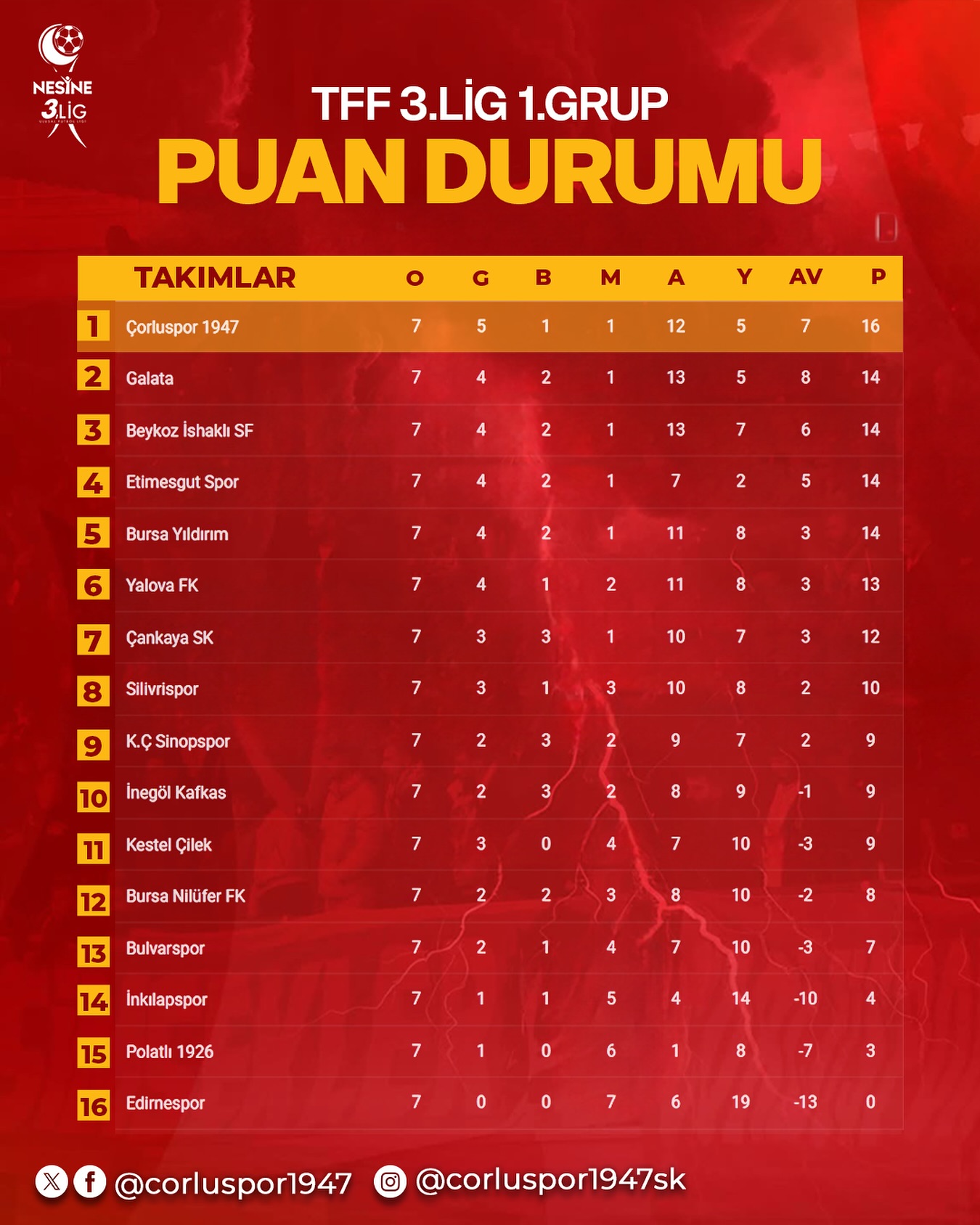 TFF 3 ligde mücadele veren Çorlu Spor 1947, Kulüp Başkanı Ahmet Bayram ve ekibi ile, sezon başında inanmış güçlü bir kadro ile başladığı ligde, 25 yıl sonra bir ilke imza atarak tarih yazdılar. Deplasman maçlarında bile Süper ligde dahi görülmeyecek şeklide tam kadro giderek Futbolcu ve teknik heyete büyük moral kaynağı olmaya devam ediyorlar. Ahmet Bayram Başkanlığındaki Çorlu Spor1947 25 yıl sonra ilk kez liderlik sevincini Çorlu’ya yaşatmanın gururu içinde şampiyonluk hedefine ilerliyor.