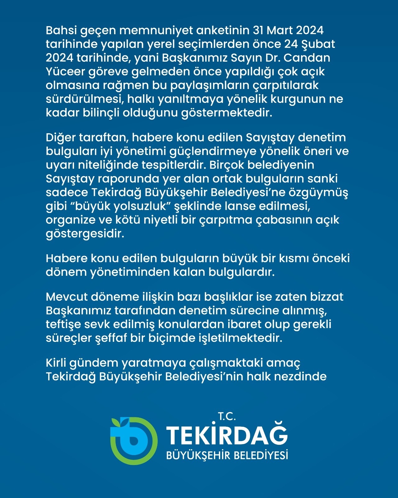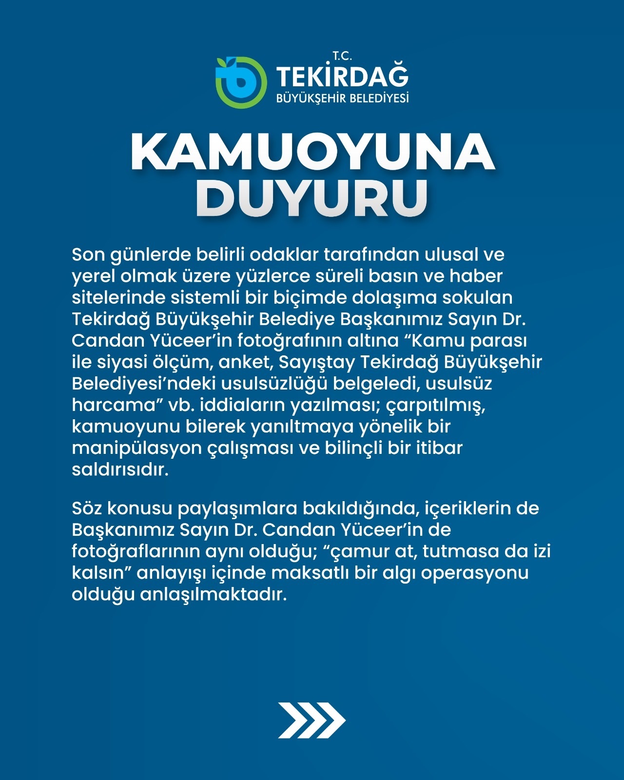 Son günlerde belirli odaklar tarafından ulusal ve yerel olmak üzere yüzlerce süreli basın ve haber sitelerinde sistemli bir biçimde dolaşıma sokulan Tekirdağ Büyükşehir Belediye Başkanımız Sayın Dr. Candan Yüceer’in fotoğrafının altına “Kamu parası ile siyasi ölçüm, anket, Sayıştay Tekirdağ Büyükşehir Belediyesi’ndeki usulsüzlüğü belgeledi, usulsüz harcama” vb. iddiaların yazılması; çarpıtılmış, kamuoyunu bilerek yanıltmaya yönelik bir manipülasyon çalışması ve bilinçli bir itibar saldırısıdır.