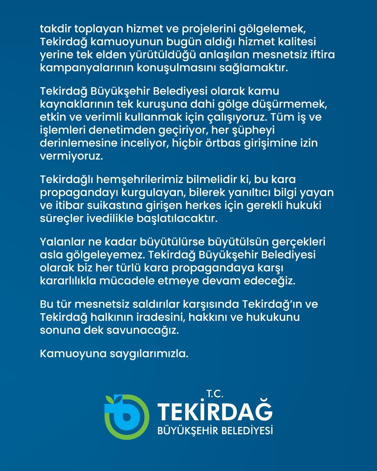 Tekirdağlı hemşehrilerimiz bilmelidir ki, bu kara propagandayı kurgulayan, bilerek yanıltıcı bilgi yayan ve itibar suikastına girişen herkes için gerekli hukuki süreçler ivedilikle başlatılacaktır. Yalanlar ne kadar büyütülürse büyütülsün gerçekleri asla gölgeleyemez. Tekirdağ Büyükşehir Belediyesi olarak biz her türlü kara propagandaya karşı kararlılıkla mücadele etmeye devam edeceğiz.Bu tür mesnetsiz saldırılar karşısında Tekirdağ’ın ve Tekirdağ halkının iradesini, hakkını ve hukukunu sonuna dek savunacağız.Kamuoyuna saygılarımızla” sözlerine yer verildi.