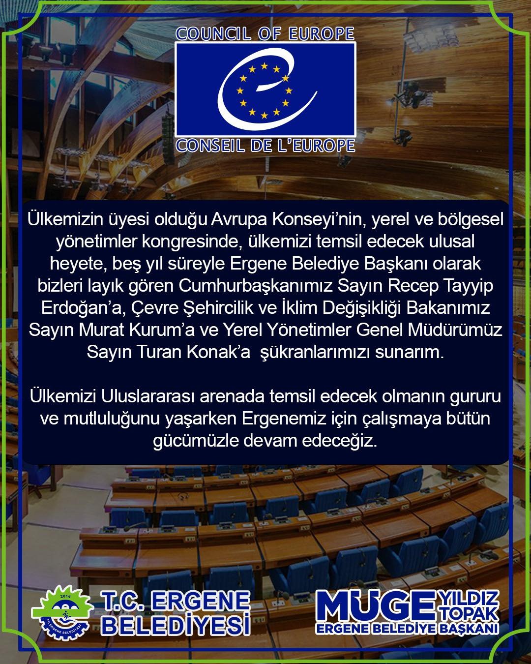 Ülkemizin üyesi olduğu Avrupa Konseyi’nde yerel yönetimlerin geleceğini şekillendiren çalışmalarda görev alacak olmanın gururunu yaşayan Başkan Müge Yıldız Topak, kendisini bu göreve layık gören Cumhurbaşkanı Sayın Recep Tayyip Erdoğan’a, Çevre, Şehircilik ve İklim Değişikliği Bakanı Sayın Murat Kurum’a ve Yerel Yönetimler Genel Müdürü Sayın Turan Konak’a teşekkürlerini iletti. Başkan Müge Yıldız Topak yaptığı açıklamada, bu görevin kendisi için büyük bir onur olduğunu vurgulayarak,