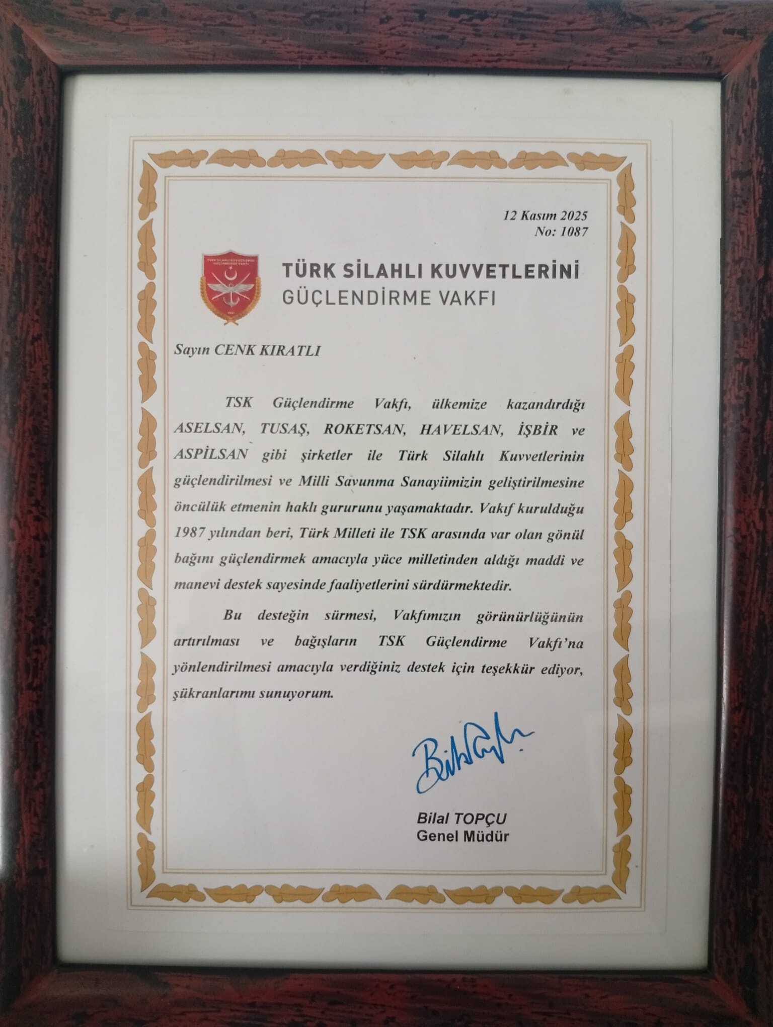Çetin Group bünyesinde uzun yıllar üst düzey yönetici olarak çalışan Cenk Kıratlı dan Türk Silahlı Kuvvetleri Güçlendirme Vakfına yaptığı anlamlı bağıştan sonra kendisine teşekkür plaketi takdim edildi. Türk Silahlı Kuvvetleri Güçlendirme Vakfı (TSKGV) Çerkezköy Şubesi’ne yaptıkları bağışlarla destek veren Cenk Kıratlı ve Bayram Karaarslan’a teşekkür plaketleri düzenlenen törenle takdim edildi.