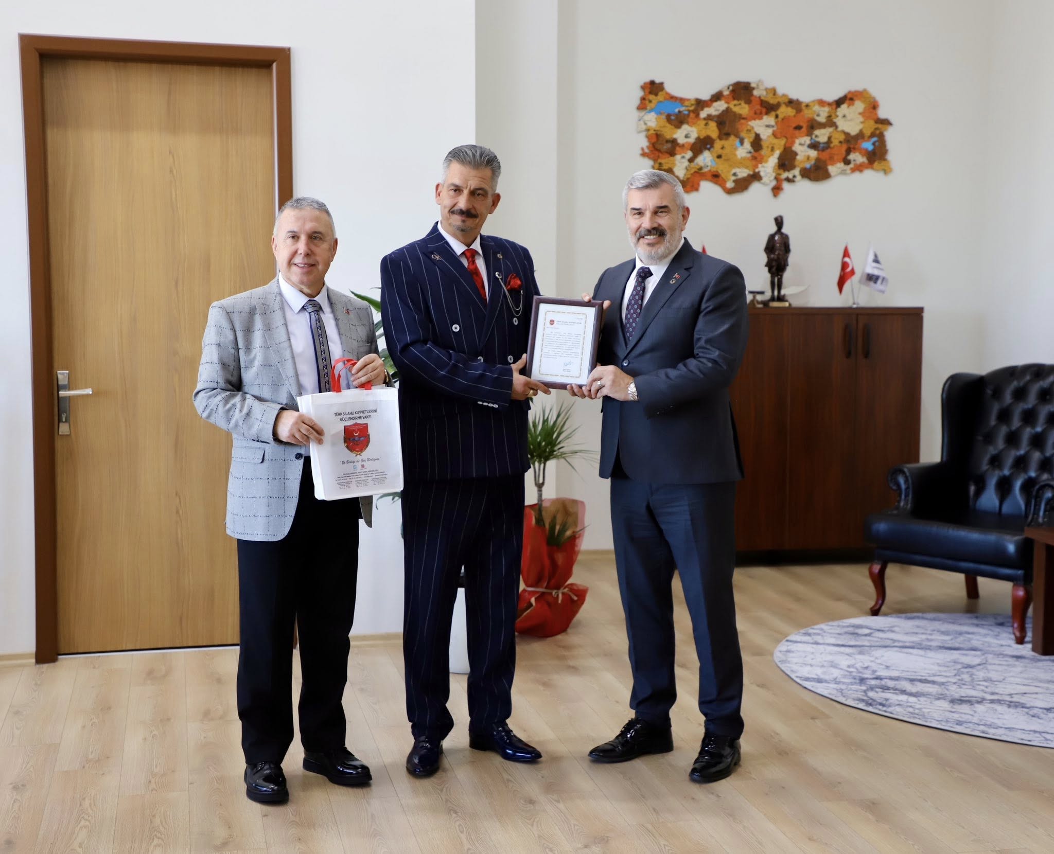 Çerkezköy Kaymakamlığı’nda gerçekleştirilen törende, bağışçılara plaketleri Çerkezköy Kaymakamı Nazmi Günlü tarafından verildi. Törende, Türk Silahlı Kuvvetleri’nin güçlendirilmesine yönelik yapılan her katkının büyük önem taşıdığı vurgulandı. Programa; Çerkezköy Kaymakamı Nazmi Günlü’nün yanı sıra Türk Silahlı Kuvvetleri Güçlendirme Vakfı Çerkezköy Şube Başkanı Serkan Karagöz, Çerkezköy Ticaret ve Sanayi Odası Yönetim Kurulu Başkanı Ahmet Çetin ile TSKGV Çerkezköy Şubesi yönetim kurulu üyeleri katıldı. Törende konuşan yetkililer, TSKGV’ye yapılan bağışların Türk Silahlı Kuvvetleri’nin yerli ve millî savunma sanayisine katkı sunduğunu belirterek, desteklerinden dolayı Cenk Kıratlı ve Bayram Karaarslan’a teşekkür etti.