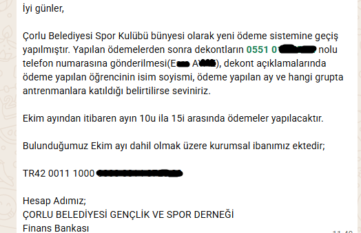Çorlu Belediyesi Spor Kulübü tarafından sporculara ve velilere gönderilen aşağıdaki bilgilendirme mesajı, kamuoyunda ciddi etik ve hukuki soru işaretleri doğurmuştur: “Çorlu Belediyesi Spor Kulübü bünyesi olarak yeni ödeme sistemine geçiş yapılmıştır. Ekim ayından itibaren ayın 10’u ila 15’i arasında ödemeler yapılacaktır. Bulunduğumuz Ekim ayı dahil olmak üzere kurumsal ibanımız ektedir;TR42 0011…………… Hesap Adı: ÇORLU BELEDİYESİ GENÇLİK VE SPOR DERNEĞİ”
